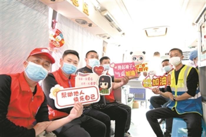 当日,爱心献血车走进成都京东方医院项目,60余名青年志愿者踊跃献血。据了解,为缓解疫情防控期间血液库存短缺问题,成都市血液中心发起无偿献血活动,市民或团体可通过预约参与。新华社发 (胥冰洁 摄)