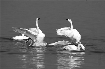 小天鹅在湖面嬉戏。姚毅 摄