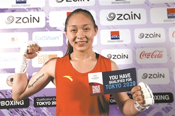 当日,在约旦安曼举行的2020年东京奥运会拳击亚洲大洋洲区资格赛女子48-51公斤级四分之一决赛中,中国选手常园战胜塔吉克斯坦选手科西莫娃,晋级四强,并获得东京奥运会参赛席位。 新华社发(穆罕默德·阿布·古什摄)