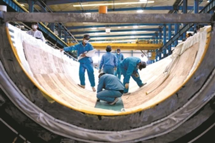 3月11日,在鄂尔多斯市时代新材蒙西分公司,工人在生产车间作业