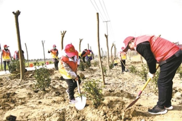 3月12日,志愿者在江苏南通如皋市如皋工业园区沿河村境内的东八里港河畔植树。近期,各地在做好新冠肺炎疫情防控的基础上举行多种形式的植树活动。