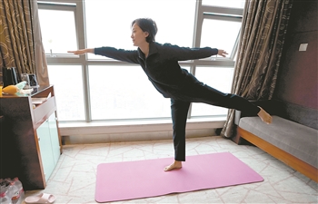 3月12日,火神山医院感染三科一病区护士郭玮在做瑜伽。当日,记者走进武汉火神山医院感染三科一病区护士的驻地,探访她们的业余生活。 新华社记者 王毓国 摄