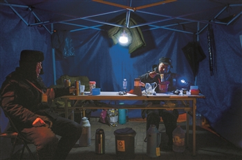 3月12日凌晨,坚守在草厂三条北口的保安张俊生(图右)和张志桓。他们的夜宵是每人一碗方便面加一个馒头。