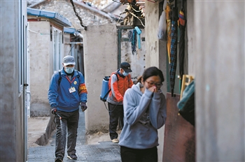 3月12日,任国庆(图左)和搭档来到前门大江社区一院落喷洒消毒液。