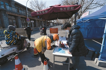 “我们从大年三十就开始排班了。我是从正月初三开始进社区做入户排查,现在和另外两名志愿者一起负责这个路口,从早上九点到晚上九点不间断。”来自前门街道办事处政务服务中心的周伟介绍说。