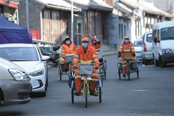 3月11日,前门街道,环卫工们走街串巷打扫卫生。
