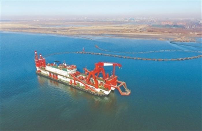 图为3月14日,一艘施工船在唐山港京唐港区25万吨级航道工程海域施工作业。