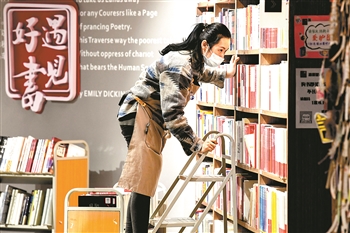 3月15日,在广西南宁漓江书院(三祺广场店),书店工作人员在整理书籍。