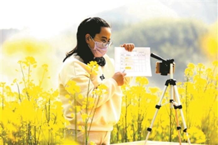 图为3月16日,浙江省杭州市临安区天目山镇藻溪小学的老师在田间向学生直播讲解油菜花相关知识。