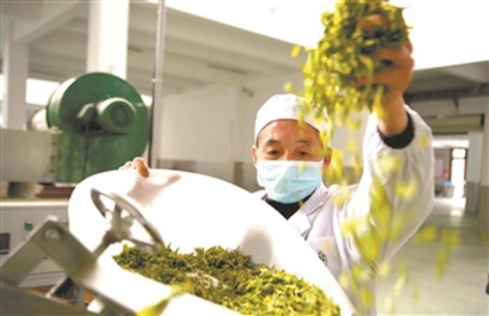 3月15日,湖北恩施市屯堡乡花枝山村有机茶专业合作社的工人将鲜叶杀青。