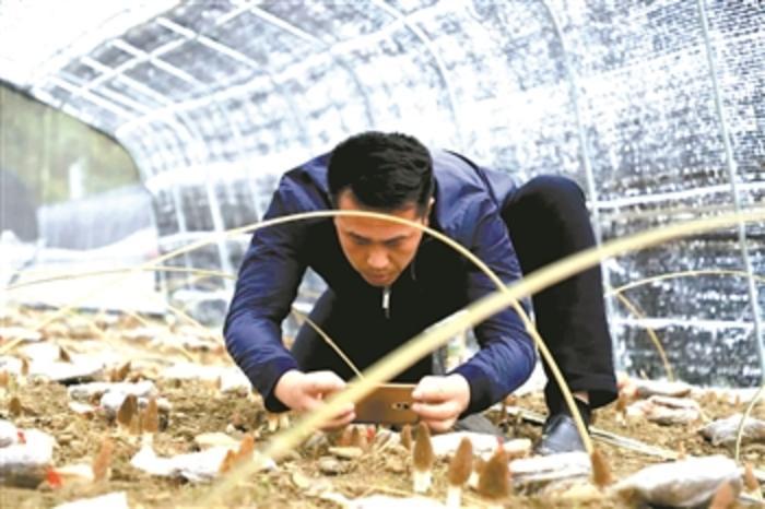 “产业村长”侯春均在大棚查看羊肚菌(资料照片)。
