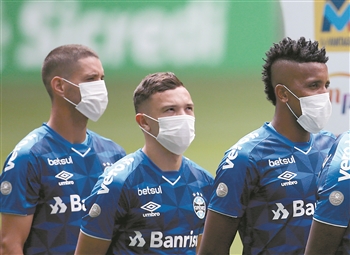 3月15日,在巴西州联赛格雷米奥对阵圣路易斯的闭门赛中,格雷米奥队球员戴口罩参加赛前开场仪式。巴西足协15日决定,从16日起巴西国内所有全国性足球比赛将无限期暂停。 新华社/路透