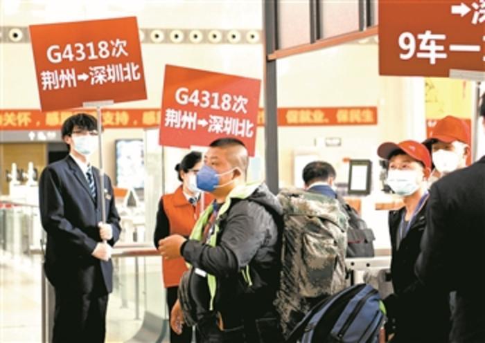 当日,两趟高铁专列从湖北荆州出发,“点对点”输送1631人前往广东企业返岗就业。13时20分许,搭乘551名务工人员的G4368专列从荆州火车站开出,这是今年春节后从湖北始发的第一列务工人员高铁专列。列车当天晚上抵达广东广州后,这些务工人员将分别回到广州、中山、东莞上班。当天15时13分,从荆州发出的G4318次列车,搭载1080人开往深圳市和东莞市,“点对点”输送务工人员返岗。 新华社记者 程敏 摄