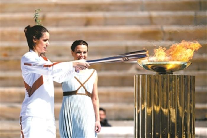 图为3月19日,最后一名火炬手里约奥运会女子撑杆跳高冠军、希腊运动员卡特琳娜·斯特凡尼季点燃圣火盆。