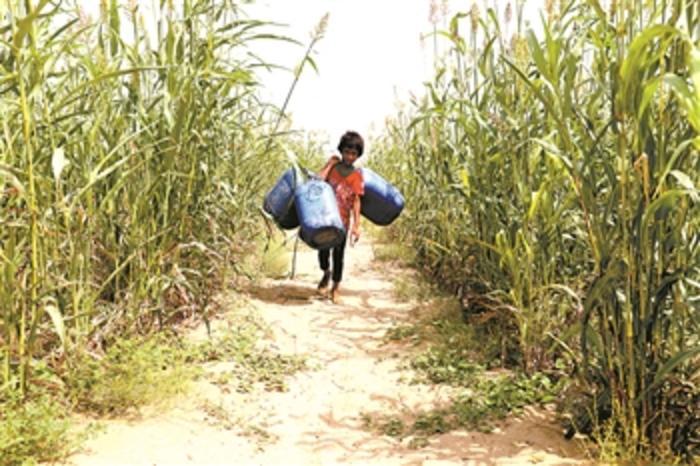 3月22日,在也门哈杰省一个村庄,一名儿童背着水桶去打水。连年战乱导致也门日常饮用水供应严重短缺。