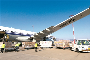 ①3月21日,在希腊雅典国际机场,工作人员从国航飞机上卸载中国援助希腊的医疗物资。