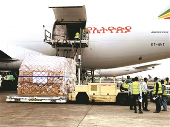 ②3月22日,在埃塞俄比亚首都亚的斯亚贝巴国际机场,工作人员将中国援助的抗疫物资运下飞机。
