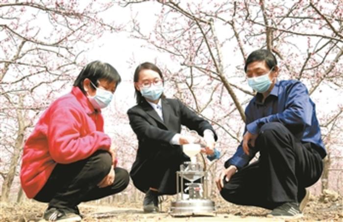 3月23日,河北省邢台市南和县气象局工作人员在和阳镇沙道村为果农介绍用于显示降雨量的双翻斗式雨量传感器。