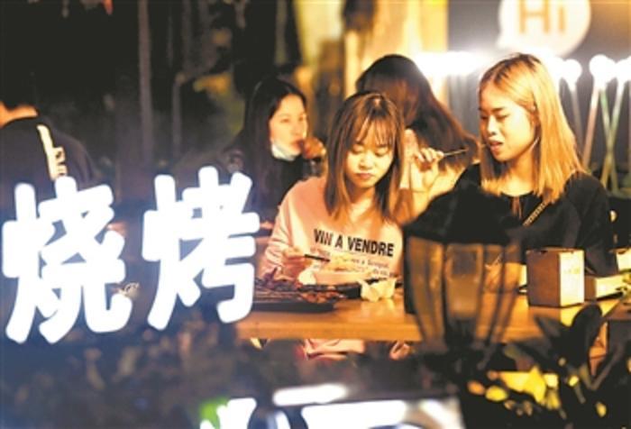 3月23日,消费者在重庆市江北区观音桥九街的一家烧烤店内用餐。日前,重庆市多措并举,在做好疫情防控的同时,积极推进餐厅、酒吧、沿街餐车等复工,有序恢复“夜经济”。