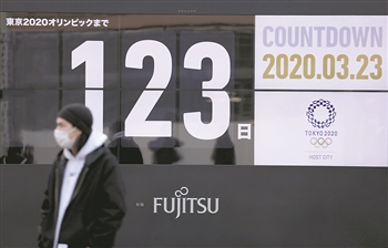 3月23日,在日本东京新桥地区,一名行人戴着口罩经过显示东京奥运会倒计时的大屏幕。