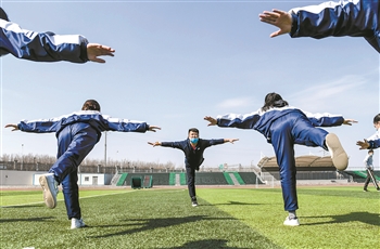 在乌鲁木齐市第一中学,体育教师陶磊在为高三12班学生上体育课。随着新冠肺炎疫情防控形势持续向好,继3月16日初三、高三和中职毕业年级学生首批开学后,23日,新疆(含新疆生产建设兵团)5004所中小学和中职学校学生迎来全面开学。