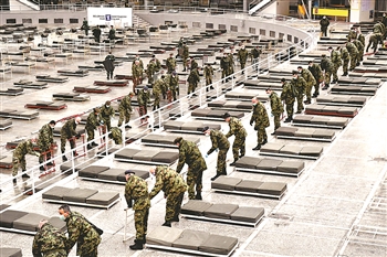 ①3月24日,在塞尔维亚首都贝尔格莱德,塞尔维亚士兵和工作人员为方舱医院组装病床。塞尔维亚国防部24日说,在中国专家组建议下,塞尔维亚开始着手把首都贝尔格莱德会展中心改建为一座方舱医院,用于收治新冠肺炎患者。新华社发(塞尔维亚国防部提供)