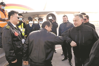 ②3月24日,在匈牙利布达佩斯李斯特国际机场,匈总理欧尔班(右一)与中方机组人员相互致意。当日,一架满载匈牙利政府从中国采购防疫物资的包机抵达布达佩斯李斯特国际机场。新华社发(陶马什·科瓦奇 摄)