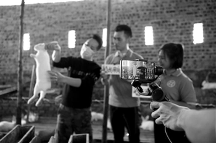 3月25日,网络直播主持人在介绍养殖户梁勇家的兔子。