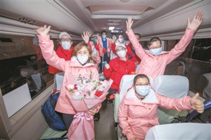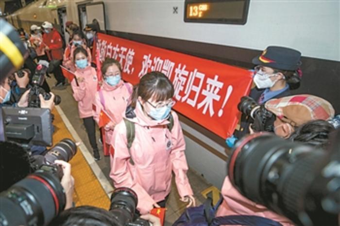 3月25日晚,北京西站,援鄂国家中医医疗队的60余名队员从武汉乘坐高铁平安返京。他们分别来自北京中医药大学东直门医院、东方医院和北京协和医学院。本报记者 王伟伟 摄