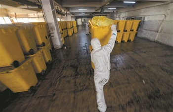 看似简单的动作实则伴随巨大的危险:有时候,针头等器械会把塑料袋扎破;塑料桶翻转的时候,医疗废物会散落开来。面对这些情况,王鹏和同事只好用手进行处理,直接与病毒“面对面”。新华社记者 费茂华 摄