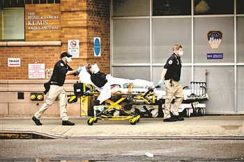 3月28日,医护人员将病人送往美国纽约布鲁克林一家医院的急诊室。 新华社发(郭克 摄)