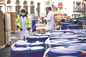 法国巴黎第6区的米尼翁路位于左岸拉丁区的中心地带,近日这里成了酒精消毒免洗洗手液的街头制作现场。药剂师法比安·布鲁诺获得巴黎市政府的批准将这条街征用为“临时工厂”,每天生产近万升酒精消毒免洗洗手液,提供给医护人员和急诊中心。 新华社发(奥雷利安·莫里萨尔 摄)