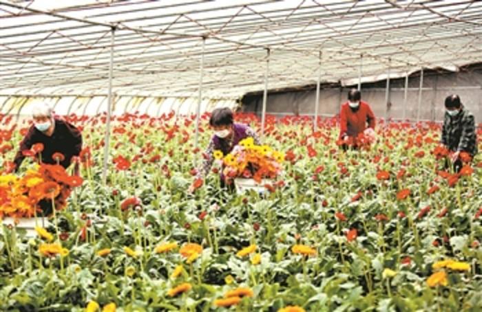 3月29日,在山东省枣庄市峄城区榴园镇富森扶贫花卉基地,村民在采摘鲜花。榴园镇采取“基地+贫困户”的模式,建设占地40余亩的扶贫花卉基地,年亩均收入8000多元,带动周边97户贫困户脱贫增收。 新华社记者 范长国 摄