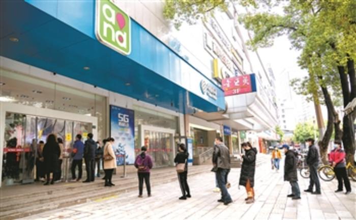 3月30日,在武汉武昌区中国移动水果湖中心营业厅,客户在门外排队等待。