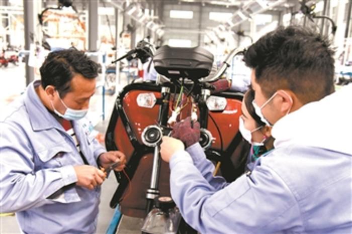 为解决易地扶贫搬迁群众的就业问题,贵州省晴隆县在位于县城的安置点附近配套建设产业园,吸引服装厂、鞋厂、电动车制造厂等多家企业入驻。复工复产以来,扶贫车间有条不紊地进行生产。 新华社记者 施钱贵 摄