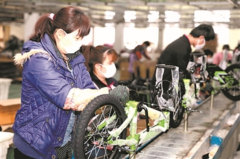 3月31日,浙江安旺自行车公司的员工正在组装儿童自行车。该企业将市场由欧美转向中东、南美洲,订单比往年有所增长。受疫情影响,浙江省诸暨市外贸企业通过转移出口市场或出口转内销等方式促进生产,减少疫情带来的影响。新华社发(郭斌 摄)