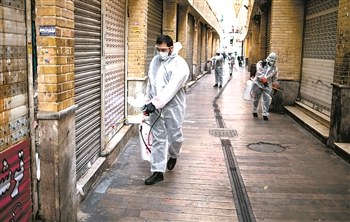 3月31日,在伊朗德黑兰,志愿者在街上喷洒消毒液。