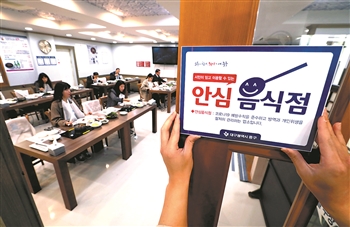4月1日,在韩国大邱,一家餐厅贴上了“放心餐厅”的指定标识牌。为减少接触,“放心餐厅”里的顾客需按一个方向间隔就坐。