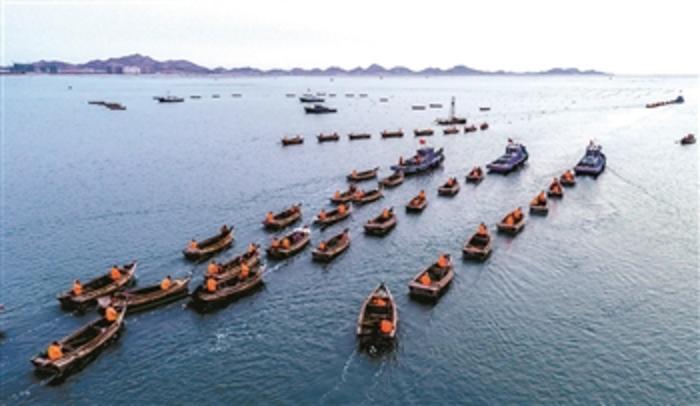 4月2日清晨,山东省荣成市成山镇鑫城山码头,拖船拖着舢板驶向海带养殖区进行作业(无人机照片)。