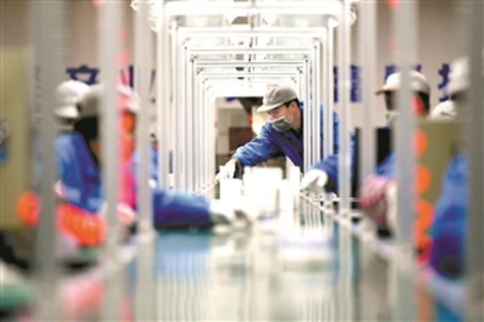 4月2日,工人在陕西省咸阳市乾县阳峪镇太平村浩泽社区工厂工作。
