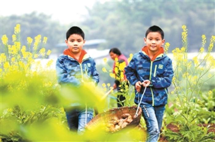 4月2日,四川省华蓥市双河小学三年级10班的刘梓熙、刘梓然,在永兴镇双龙桥村5组帮助外婆在田间抬运土豆,感受劳动的艰辛和光荣。