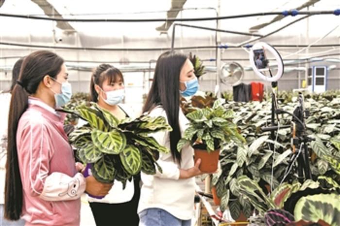 4月3日,在山东省滨州市惠民县石庙镇骏茂花卉种植大棚,工作人员进行网上直播。
