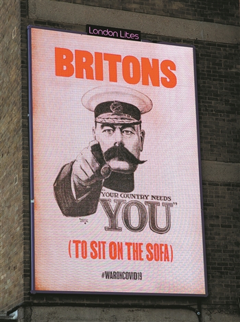 4月3日,英国伦敦街头的宣传海报劝导人们不要出门,海报上写着“英国人,你的国家需要你(坐在沙发上)”。