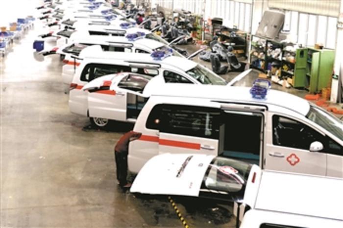 工作人员在江淮汽车商务车公司改装救护车(2月25日摄)。