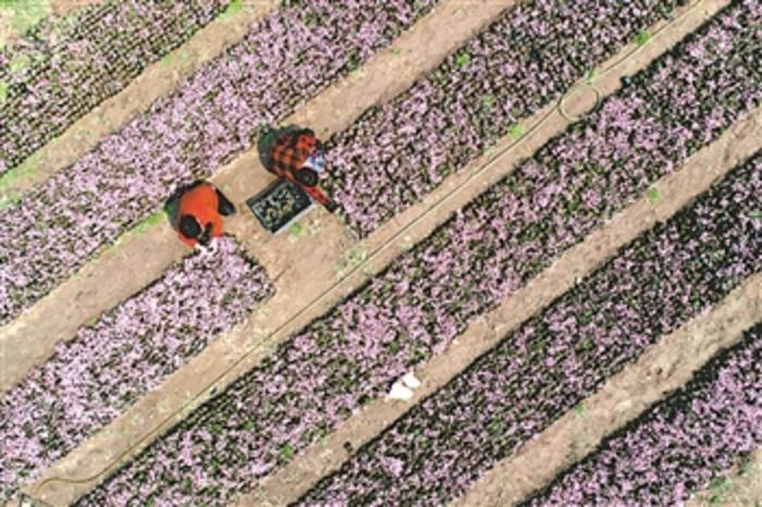 4月7日,沙河市红石沟现代农业园区的员工在打理花苗(无人机照片)。
