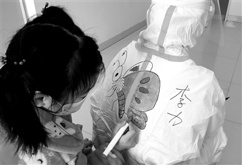 在武汉儿童医院新冠患儿隔离病房内,一名儿童为医护人员防护服上的卡通画涂色。 新华社发