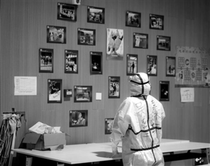 送走最后一批痊愈病人后,武昌方舱医院一名医护人员久久注视着照片墙。照片上都是舱内患者和医护人员。新华社记者 肖艺九 摄