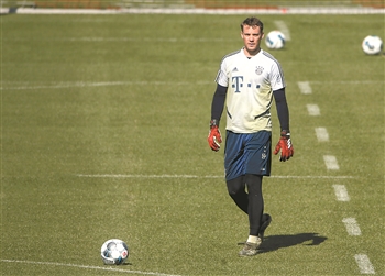 4月6日,德甲拜仁慕尼黑队恢复场地训练,训练内容以长传、射门和体能等“无身体接触”项目为主。图为拜仁慕尼黑队守门员诺伊尔在训练中。新华社发(菲利普·鲁伊兹摄)