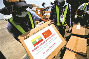 4月8日,在缅甸仰光国际机场,工作人员搬运中方捐赠的抗疫物资。新华社发(吴昂 摄)