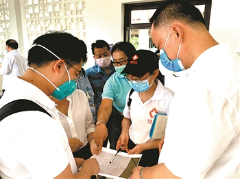 4月7日,在老挝北部琅勃拉邦,中国抗疫医疗专家组专家(中)调研当地医院情况。新华社发(中国援老抗疫医疗专家组供图)